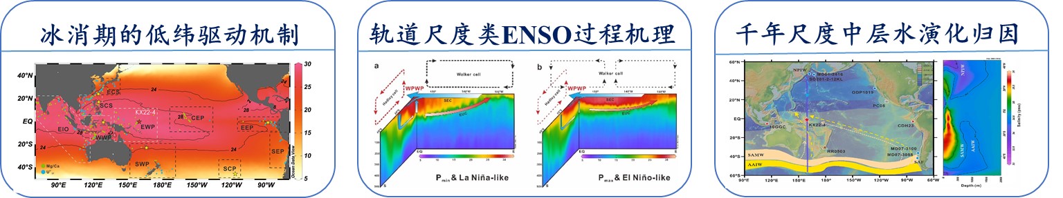 主要研究方向为古海洋古气候学,重点关注晚更新世以来热带太平洋的海气过程。在《第四纪研究》文中阐述了热带太平洋纬向温度梯度与热带辐合带迁移密切相关,并影响东亚夏季风降雨,热带降雨与东亚降雨反相关。在CJOL文中提出轨道尺度上太平洋经向与纬向温度梯度变化之间的耦合关系,类厄尔尼诺-南方涛动(类ENSO)状态转变与气候态的稳定性密切相关。在CEE文中利用地化指标和数值模拟揭示了过去36万年,与浅层经向翻转环流相关的西太平洋暖池次表层温盐通过控制上部水体层化结构,调节岁差频段的类ENSO过程的机理,首次为轨道岁差控制ENSO假说提供了证据及其动力过程,为模拟和预测未来长时间尺度上气候变化提供了良好的依据。在NC文中,为解决末次冰期以来ENSO演化的争议提供了系统的依据,并阐述了全球变暖中热带海洋热含量变化与南大洋之间的耦合关系。在P3文中,证明了南大洋在全球千年尺度快速气候变化中的关键作用,特别是对中深层水体的调控。