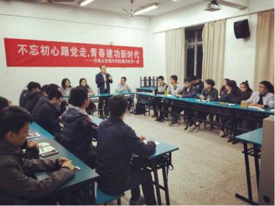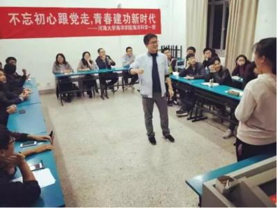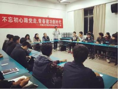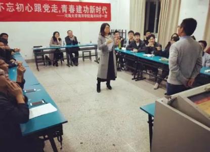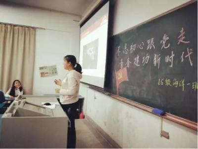 2017年11月16日,16级海洋科学一班在磁力熊 江宁校区召开“不忘初心跟党走,青春建功新时代”主题班会。参会人员有后勤服务中心曹继平主任、磁力熊 党总支王永芝书记、16级海洋科学一班班主任王涛老师、磁力熊 团委书记安杰晶老师以及海洋科学一班全体同学。此次班会旨在对十九大精神进行宣传教育,团结引领大家听党话、跟党走。