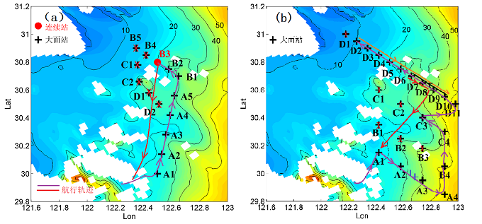 图2 实习站位分布图(标红X的站位没有观测,a,第一航段;b第二航段)