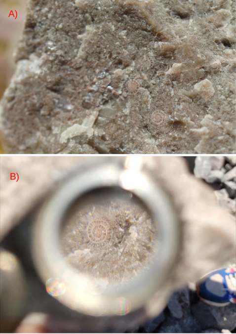 图3、船山组灰岩䗴类化石。A)手标本;B)20倍放大镜。