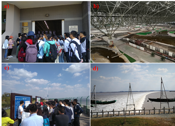 a)和b)六堡试验基地参观c)老盐仓听取钱塘江大潮形成原因的讲解d)现场观看老盐仓一线潮