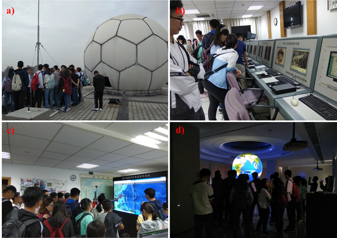a)卫星天线;b)卫星数据处理中心;c)Argo中心;d)小球大世界展台