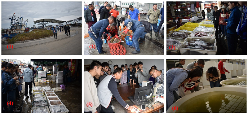 10月20日上午,同学们乘车到达吕四渔港,参观了解停泊在港口的各式各样渔船,巧遇渔船卸货,看到一筐筐海鲜正从渔船上被卸下,同学们都很兴奋。随后参观了海鲜批发市场和零售市场,在两位带队老师的讲解下,掌握了辨别常见海洋生物的诀窍,了解了海鲜从源头到菜篮子的运输分销过程。随后,一行人到达江苏省海水养殖引繁中心进行参观,通过对比观察文蛤在选育过程中的形态变化,直观地感受到了水产品育种的意义,学习到了文蛤的养殖以及育种相关知识。