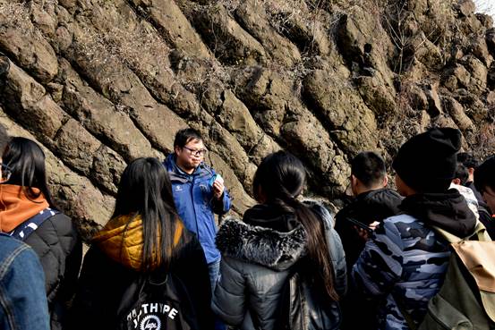 12月16日上午,抵达六合国家地质公园后,讲解老师带队参观由玄武岩构成的石柱林。通过老师的讲解,同学们了解了基性火成岩玄武岩与超基性岩地幔包体橄榄岩的产生原因,岩浆岩的地质分类和种类,学习了与内外动力地质作用有关的知识点,玄武岩“柱状节理”,“杏仁状气孔”的形成过程。除了聆听老师的讲解,同学们还仔细观察了玄武岩的颜色,气孔,节理面等物理特征,在玄武岩节理面上找寻淡绿色的橄榄岩包体,对玄武岩和地幔包体有了更直观的认知。参观完石柱林,同学们跟随带队老师登山远眺远处两座死火山的火山锥形貌,感受大自然强大的创造力。