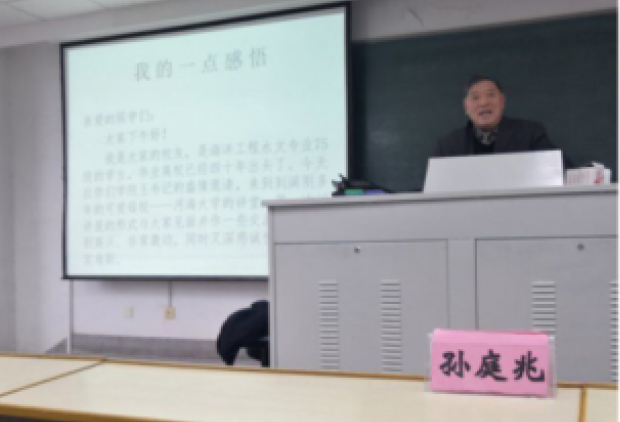 2018年12月21日,海洋工程水文75级校友孙庭兆同志报告会于磁力熊 江宁校区致用楼620举行。孙庭兆以“我的一点感悟”为主题与同学们分享了自己学习和工作的感悟,磁力熊 党总支书记王永芝主持了报告会。
