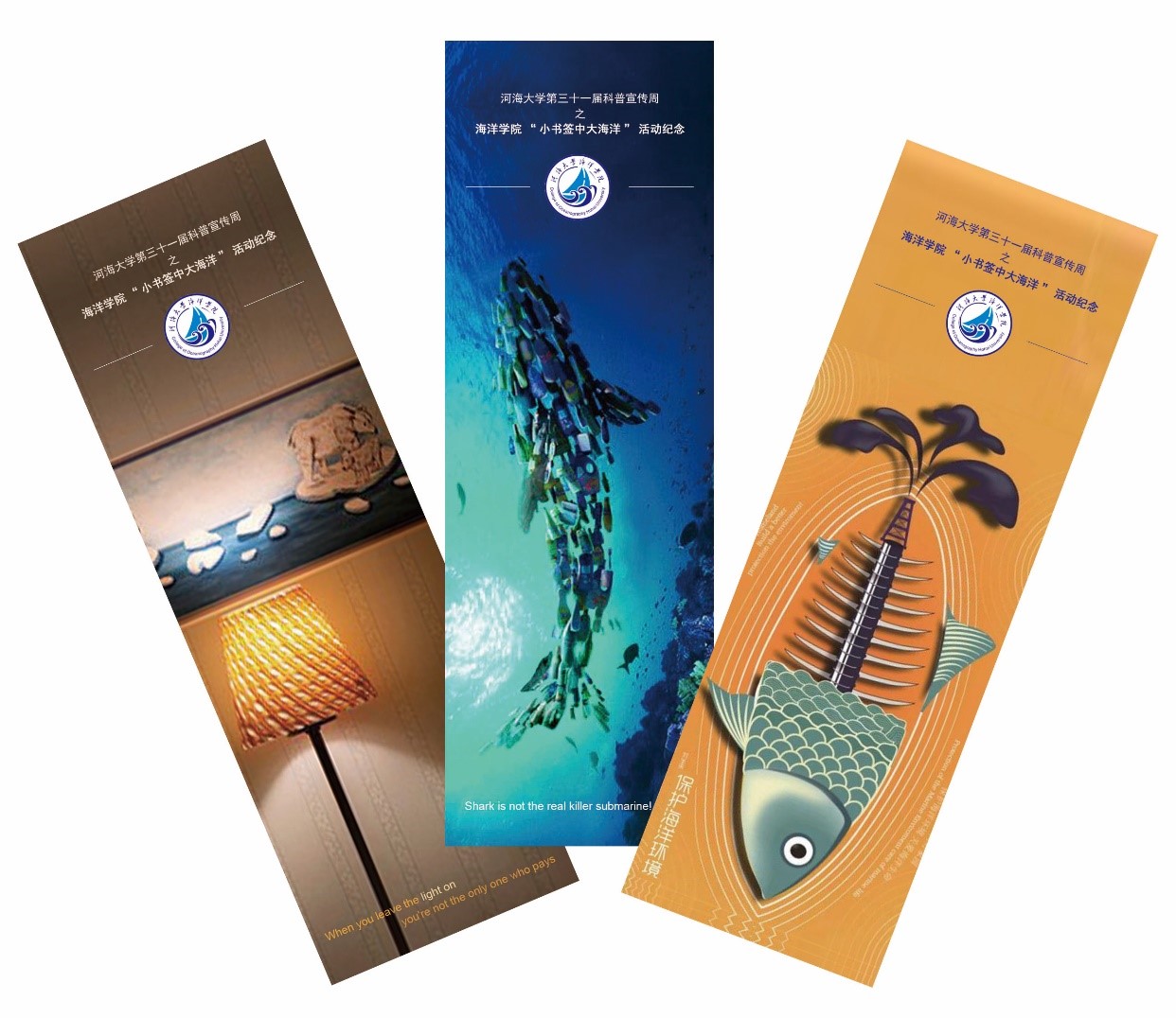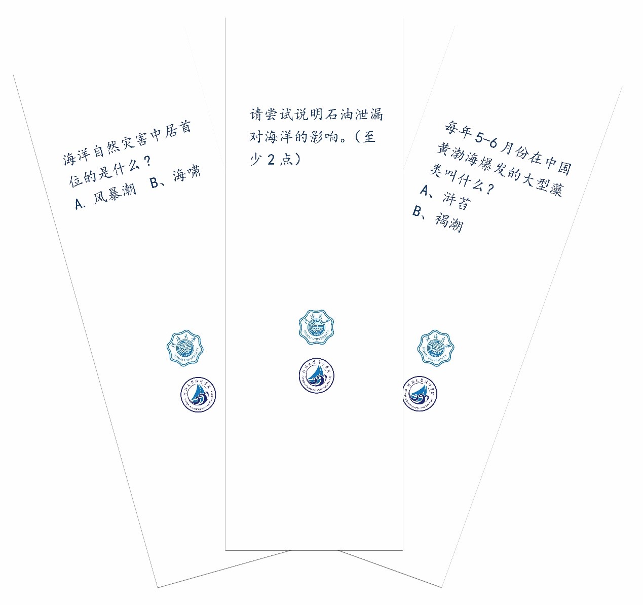 此次活动的形式是将海洋知识的相关题目,按三个等级,分别印制在三种特别设计的书签上,同学们在挂有书签的选题区选好题目,拿着书签到一旁的兑奖区答题领奖。书签正面特意选用了反映海洋环境问题的图片,分别是:气候变暖导致两极冰川融化,威胁生物生存(图左);海洋中的塑料垃圾对海洋生物造成巨大危害(图中);人类活动导致的石油泄漏严重破坏海洋生态环境(图右)。选题中除了海洋专业性科普知识问题外,还涉及了很多海洋环境保护的问题。参与者可以选择不同难度的题目进行回答,回答正确者即可以得到精美礼物一份,并且选中的书签也可以带走留作纪念。