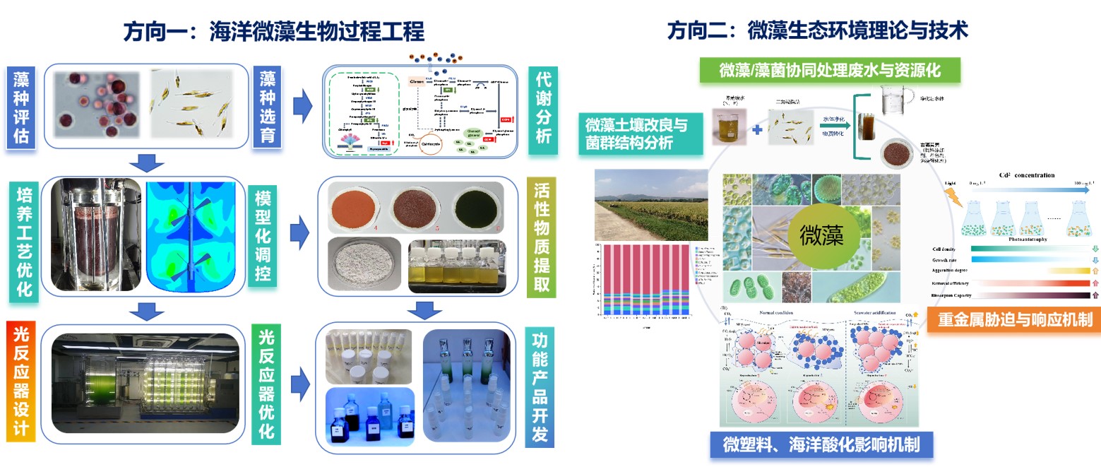 1. 微藻生物工程技术:海洋微藻培养、藻类活性物质及功效评价、藻类高附加值产品开发、过程模拟及模型化、藻细胞代谢途径分析