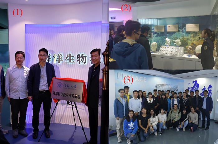 1)海洋科学教学实习基地揭牌2、3)参观海洋生物科普馆