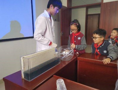 2017级李云峰同学和2016级陈秋阳同学为同学们演示海洋内波实验和黑水实验,并邀请小朋友们亲身参与体会。