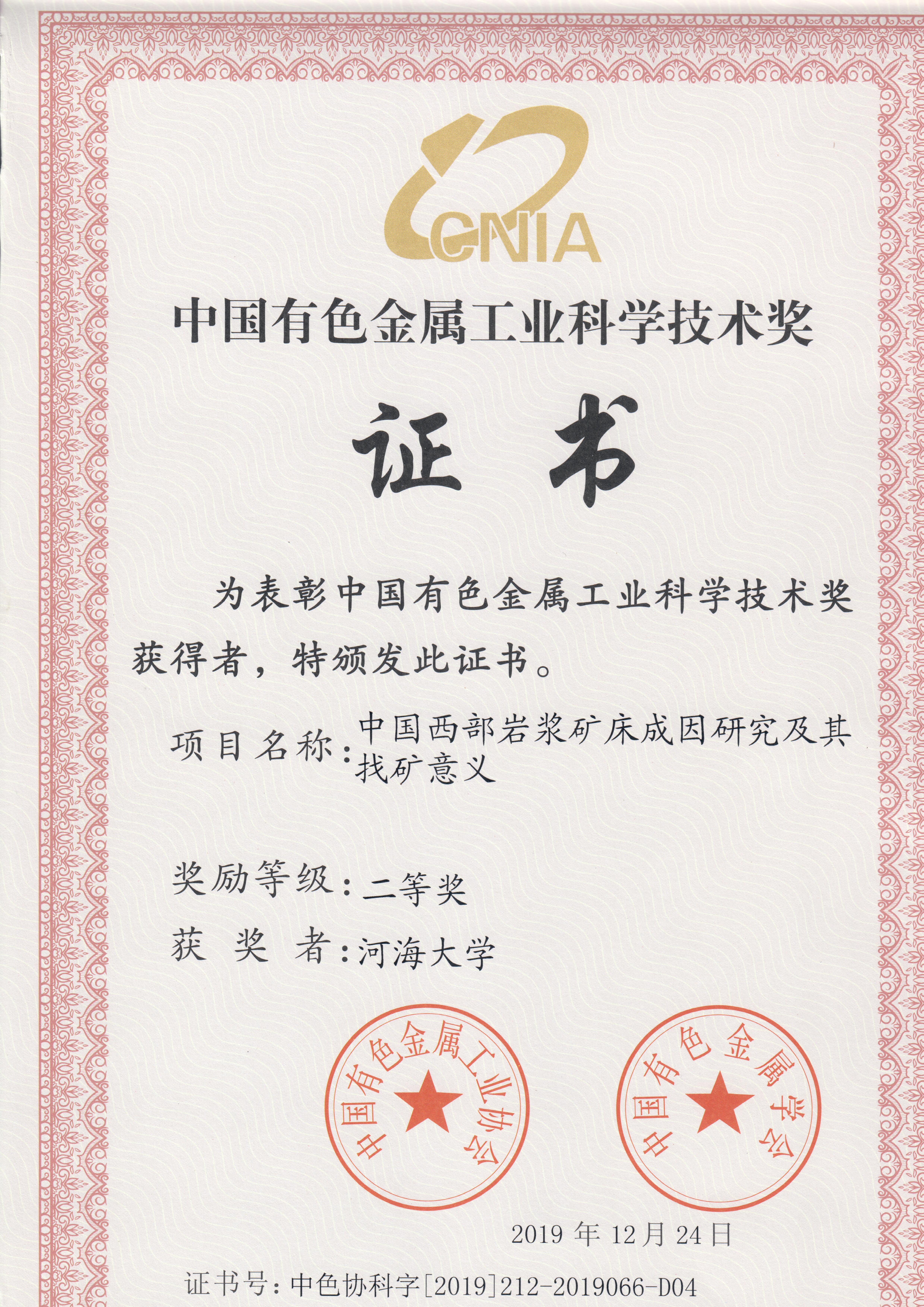 磁力熊 颉炜副教授以磁力熊 为第三完成单位参与中国科学院地球化学研究所宋谢炎研究员牵头的《中国西部岩浆矿床成因研究及其找矿意义》项目,在岩浆通道成矿理论和高精度PGE分析方法、中亚造山带铜镍硫化物成矿规律、峨眉山大火成岩省岩浆成矿作用和扬子地块西缘中-新元古代岩浆矿床成矿规律等方面取得了很多重要进展,获得中国有色金属工业科学技术奖二等奖。