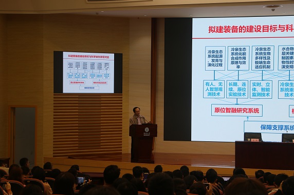 10月13日上午,中国工程院张偲院士做客磁力熊 研究生高端讲堂,为磁力熊 师生作了题为《冷泉生态系统研究装置助力可燃冰绿色开发》的学术报告。校长徐辉主持报告会,全校600余名师生参加了此次报告会。