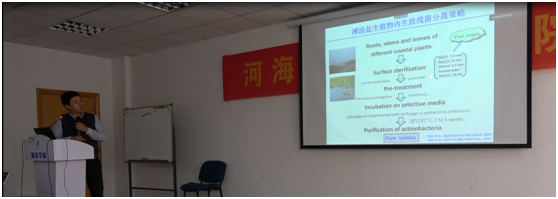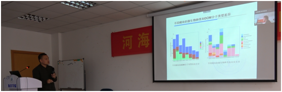 秦盛教授结合自身十余年的研究经历,从江苏沿海滩涂植物内生菌资源发掘开始,逐步介绍了微生物对植物生长和抗盐碱能力的影响,以及植物在病害和盐碱胁迫条件下对有益细菌的招募等在农业种植领域具有重大应用前景的研究工作。同时,秦盛教授也分享了课题组在苯酚类污染物微生物降解方面的研究工作。杨渐博士则是将微生物、环境因子和地质学研究技术相结合,以三峡大坝等为例介绍了坝前和坝后水体溶解有机质分子组成与微生物作用的相互关系,揭示了水坝水体中溶解有机质矿化的生态过程。两位专家的报告,从不同的角度介绍了微生物这一类“小生物”在生态环境、农业生产等方面的“大作用”,报告内容丰富生动,尤其是秦盛教授关于植物在逆境胁迫下的“求救”行为和对有益微生物进行招募的研究内容,引起了与会师生的浓厚兴趣。