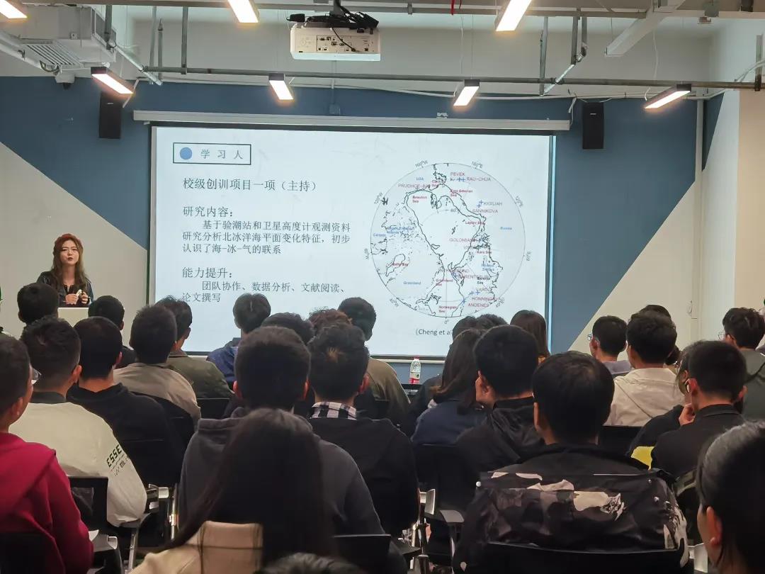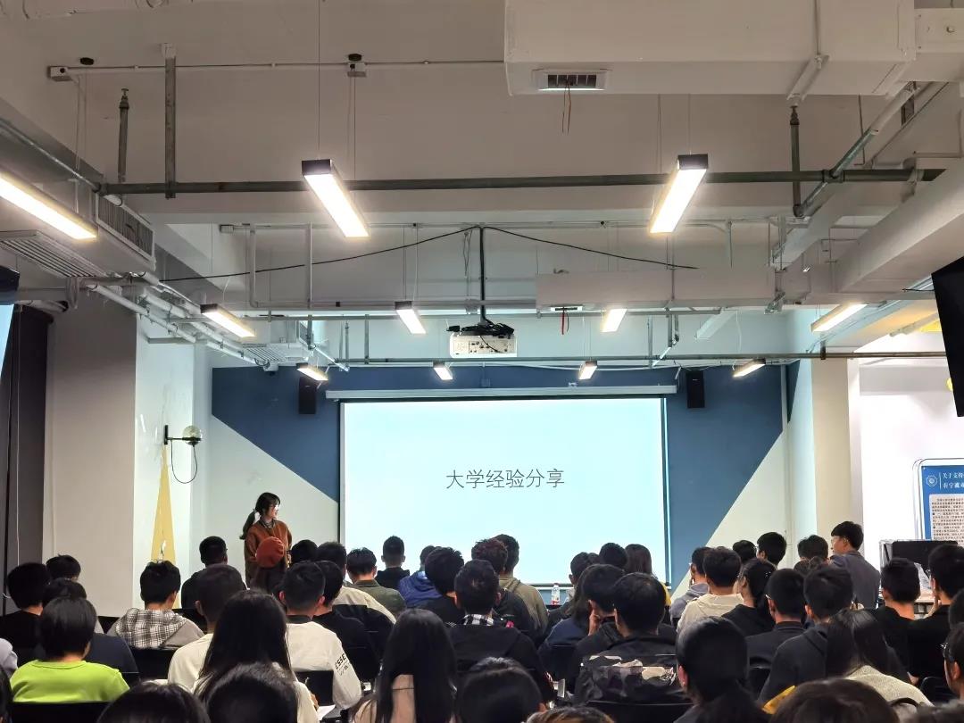 交流会在阵阵热烈的掌声中开始。首先,由郑璐曦同学带来大学生活总览,学姐的讲述侧重生活,以轻快幽默,平易近人的语言带我们梦入如诗如画的大学生活,学习,竞赛,双学位,宿舍生活,同学们皆向往之。宿舍整洁,目标明确,坚忍不拔便是她的良策。