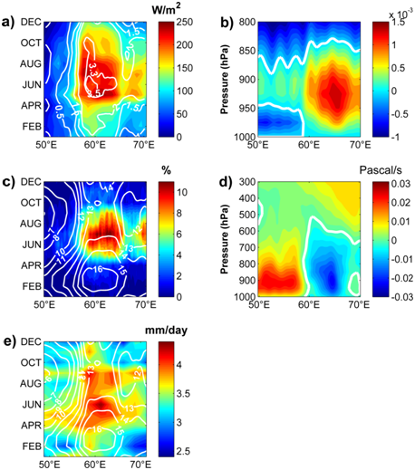 2区域B43°S纬向断面上的(a)海气温差SST-SAT,白色等值线)和海气通量QS+QL的年循环b南半球冬季的垂向动量交换(单位:m/s2),本文中垂向动量交换由公式<!--[if !msEquation]--><!--[endif]-->计算;(c)大风频率的年循环(单位:%);(d)南半球冬季垂向风速的气候态平均,即上升运动(单位:Pascal/s,向下为正);(e)降雨的年循环(单位:mm/day);(c)和(e)中的白线是OISSTSST年平均等值线,(b)和(d)中的白线是各自的零等值线。