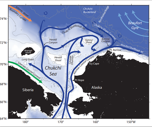太平洋水经过白令海峡进入北冰洋,同时带来淡水和营养物质,对于北冰洋的温盐结构和生态系统有重要意义。近期的观测结果表明,大量太平洋水通过巴罗海谷离开楚科奇陆架,然后在楚科奇陆坡区域形成了一支向西的流动,即楚科奇陆坡流(Corlett and Pickart, 2017)。