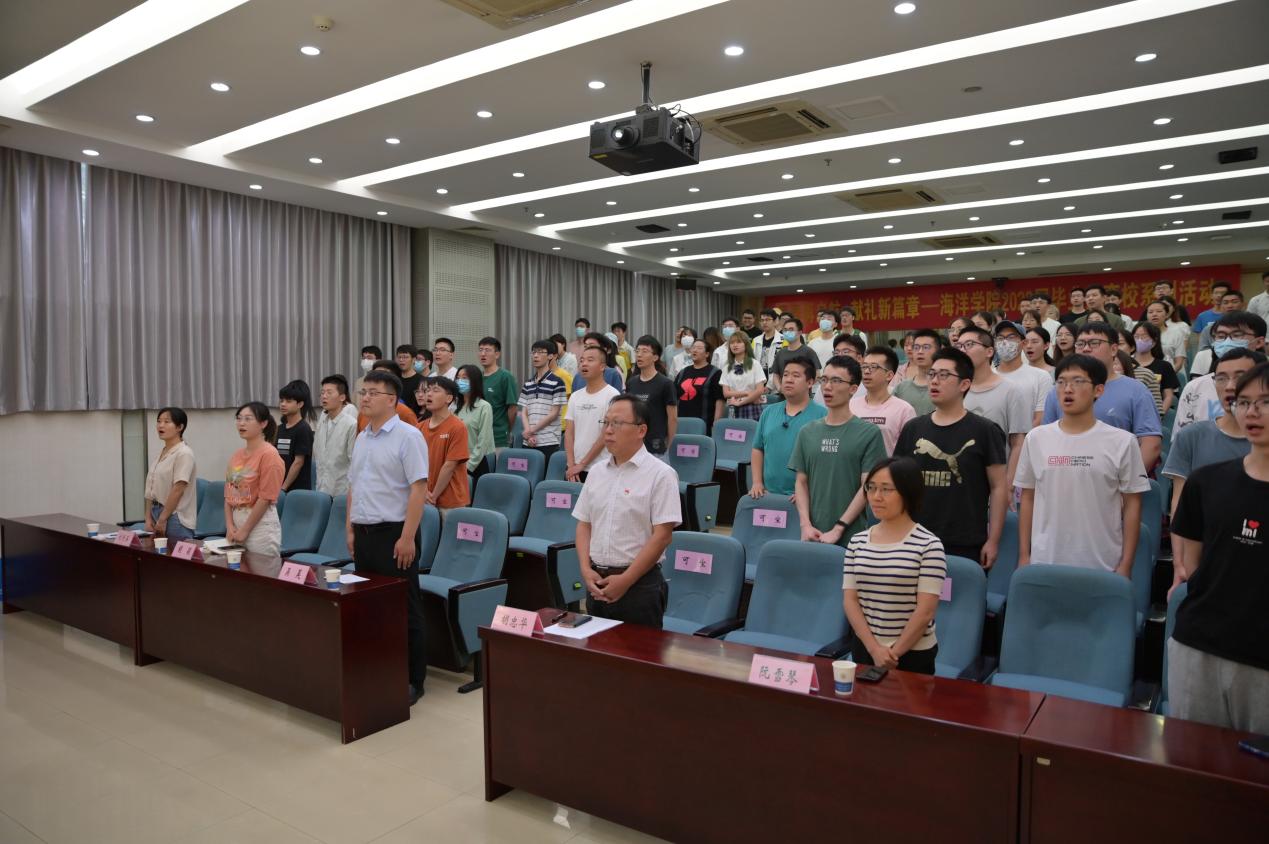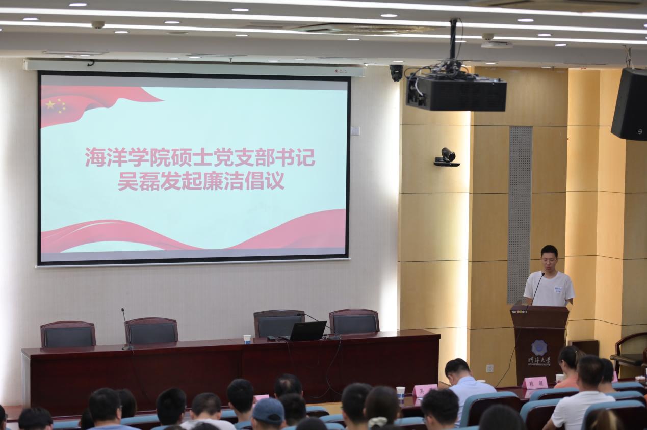 硕士生党支部书记吴磊作为毕业生代表发起廉洁从业倡议,他倡议,毕业生要坚定理想信念,加强道德修养;树立廉洁意识,倡导诚信风气;学习百年党史,矢志不渝奋斗,要时刻铭记校训,在岗位上挥洒汗水实现人生价值,不负伟大新时代,让青春在为祖国、为民族、为人民的不懈奋斗中绽放绚丽之花。全体毕业生们起立,在领誓人吴磊的带领下,郑重发起廉洁从业承诺。