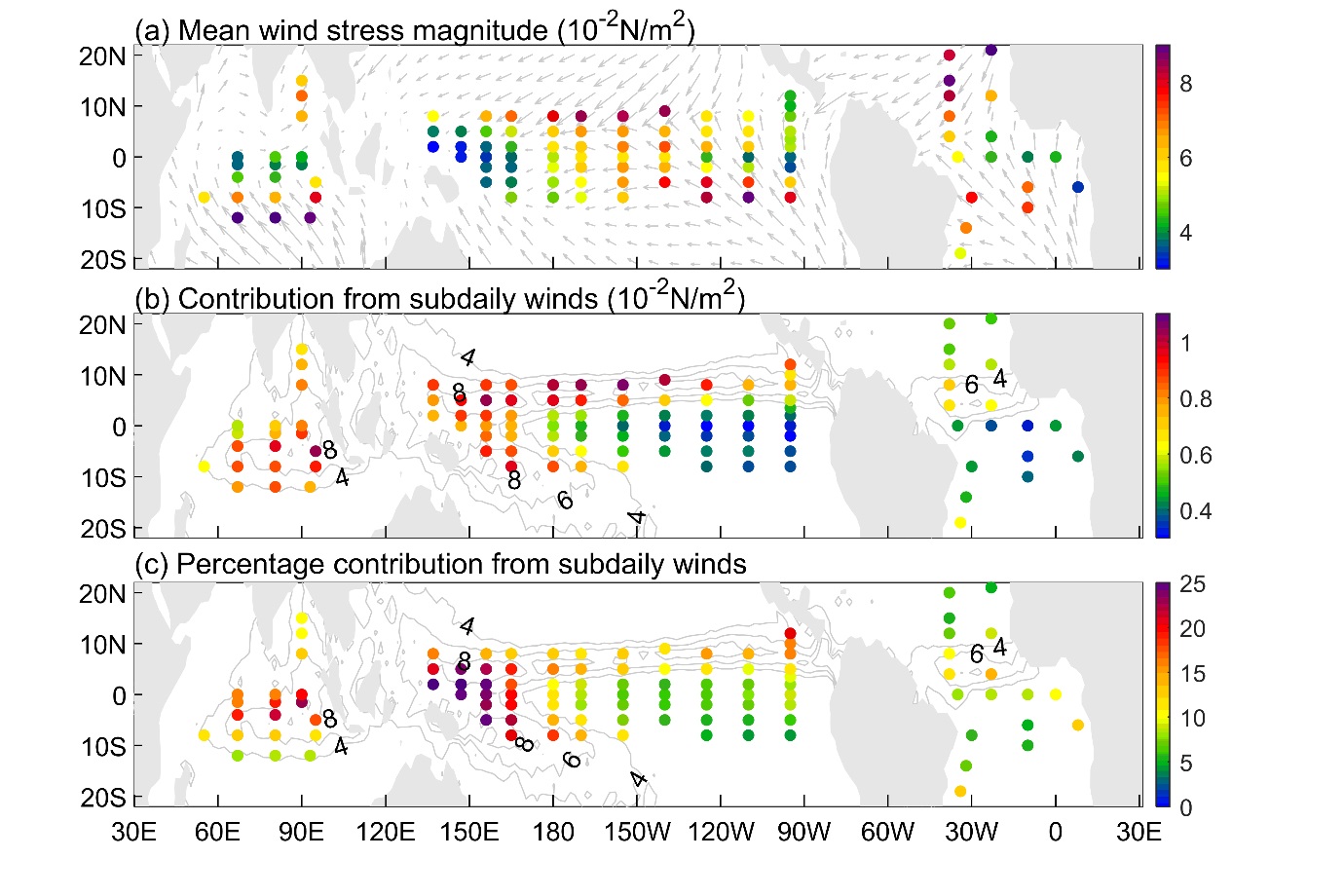 近日,磁力熊 海气相互作用研究团队利用全球热带锚系浮标观测揭示了风场日内变化在海气动量通量中的关键作用。该研究成果“Key role of subdaily wind variability for tropical surface wind stress”发表在Journal of Physical Oceanography,闫运伟教授为论文第一作者兼通讯作者,合作者包括学院宋翔洲教授和英国国家海洋学中心Marilena Oltmanns博士。