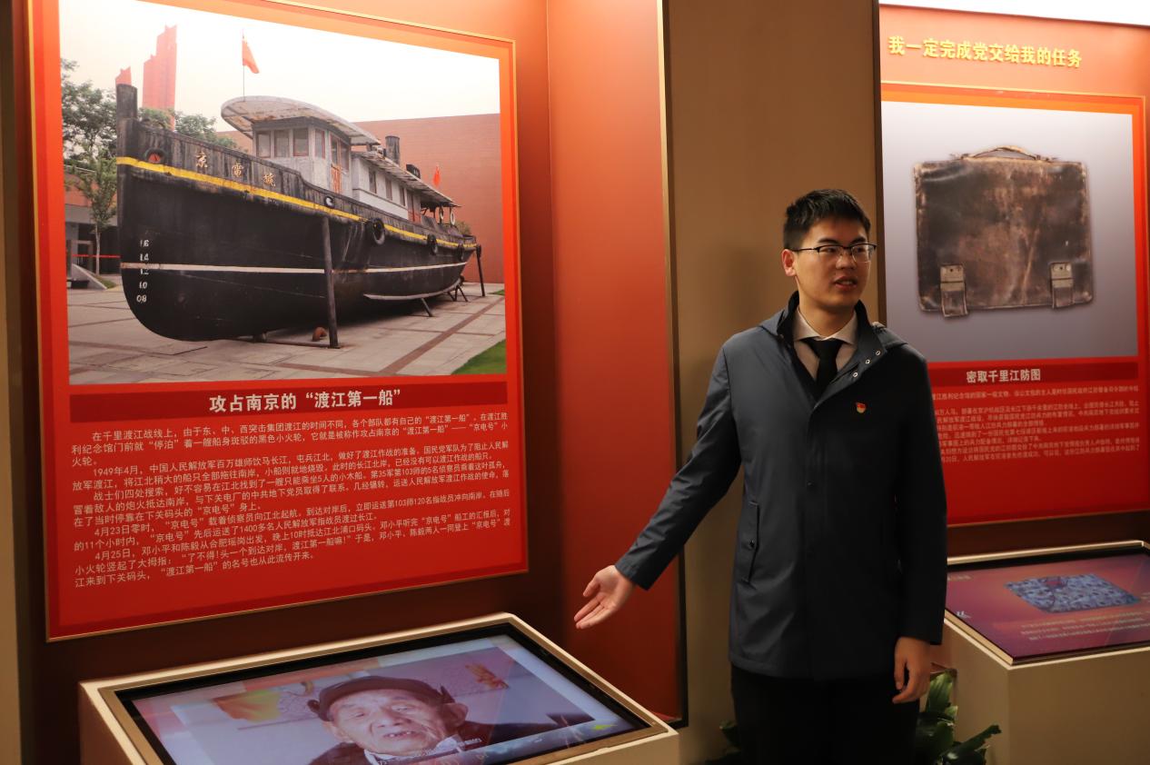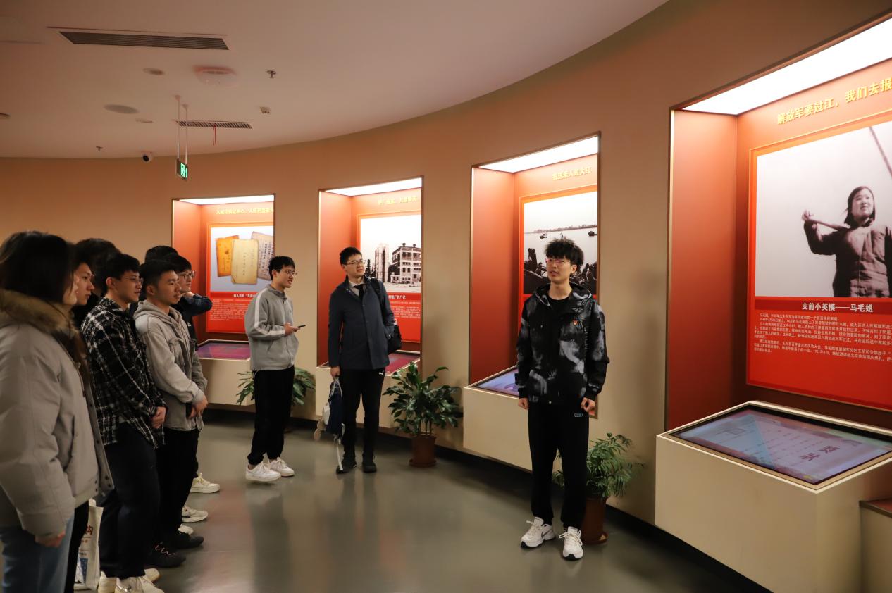 三名成员在馆内分别讲述了一堂生动的“微党课”,开展有声、有势、有热度的学习教育。王潇翔同学讲解了攻占南京的“渡江第一船”——“京电号”小火轮。中国人民解放军百万雄师饮马长江,做好渡江准备后,国民党军队竟把大小船只都控制起来,想阻止解放军渡江,但战士们并没有就此放弃,而是找到一艘小木船,这一艘只能承载5人的小木船,在11个小时内竟先后运送了1400多名人民解放军指战员渡过长江,“渡江第一船”的名号从此流传开来。