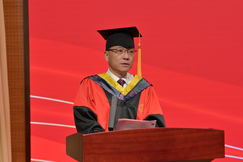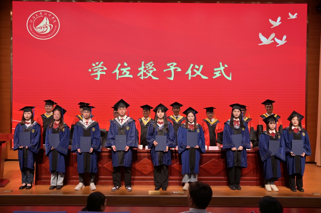 典礼嘉宾、83级海洋工程水文专业杰出校友邓东升董事长向毕业生们表示最诚挚的祝贺,向母校和老师们致以最崇高的敬意。他以“海”为题与毕业生们分享了自己的几点感悟。一是要以“海的风度”塑形象,彰显新时代河海海洋人的特质,希望毕业生永葆追逐理想的热情、永葆吃苦耐劳的毅力、永葆无私奉献的品格。二是要以“海的气度”宽胸襟,彰显新时代河海海洋人的格局,做到善于倾听能容言、求同存异能容事、换位思考能容人。三是要以“海的深度”练内功,彰显新时代河海海洋人的底蕴,做到勤于学习多充电、肯于钻研多增能、勇于创新多探索。四是要以“海的力度”干事业,彰显新时代河海海洋人的担当。做到学会用狠劲干事业、学会用拼劲干事业、学会用韧劲干事业。勉励毕业生们传承河海精神,怀揣海洋梦想,在新的人生征途上,追逐属于自己的诗和远方。