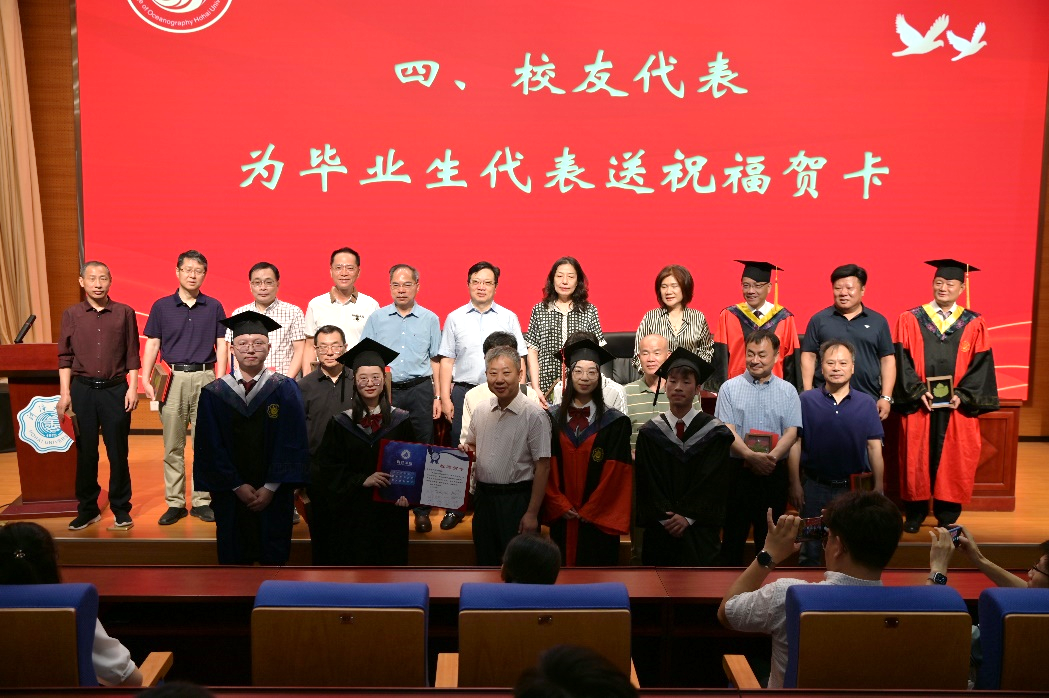 典礼上,学院党委书记胡忠华、院长宋翔洲为校友颁发荣誉证书,毕业生代表为校友嘉宾赠送承载河海记忆的纪念品——河海梧桐叶,校友代表为毕业生赠送祝福卡片,并合影留念。