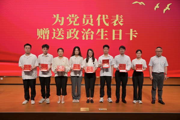 政治生日会上,党委书记胡忠华向党员代表赠送印有党员姓名、入党时间及入党誓词的“政治生日”贺卡,并送上组织寄语,传递温情与关爱,寄予殷切嘱托与期望,勉励各位党员要努力践行入党初心,认真履行党员义务,为共产主义事业奉献力量。