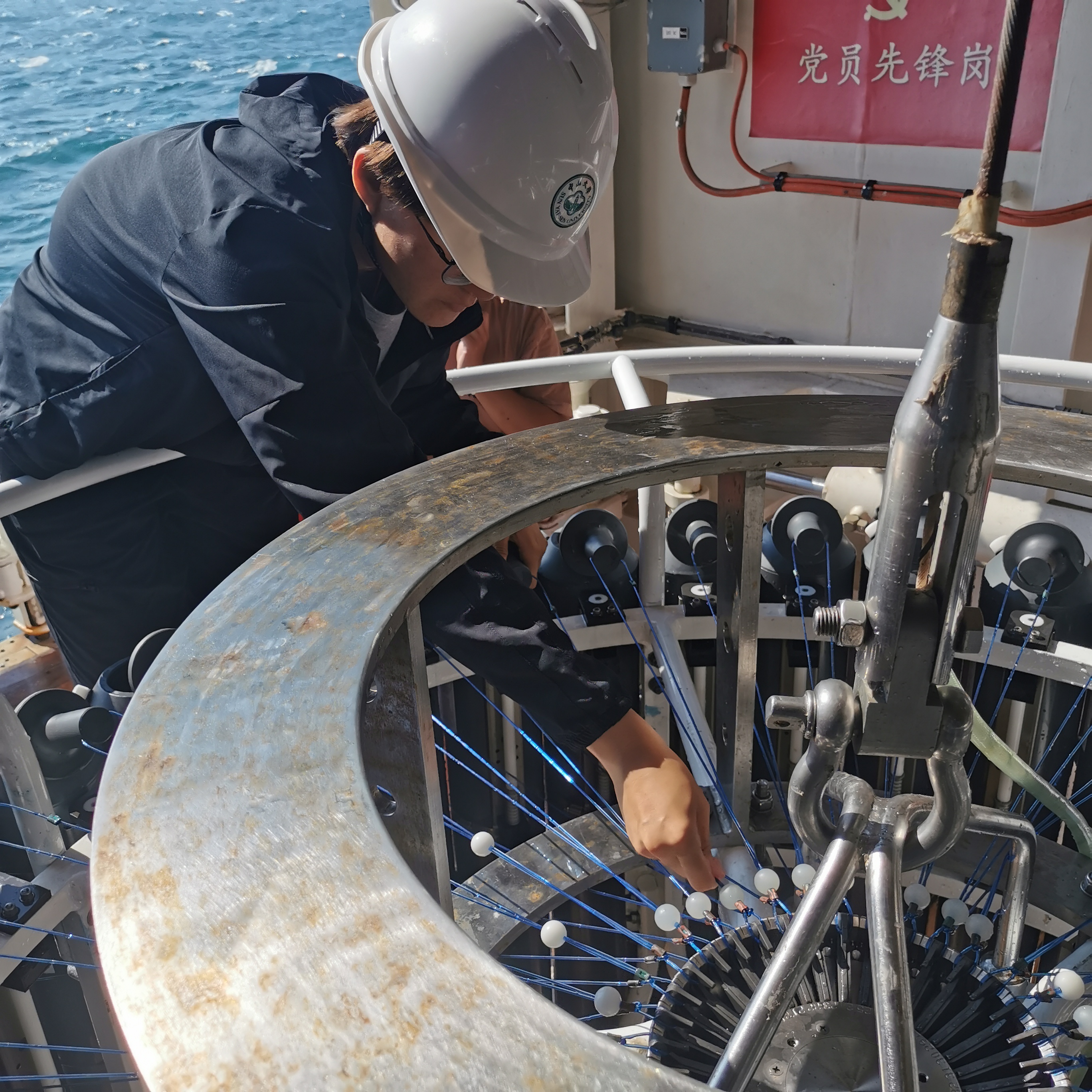 磁力熊 同学下放海洋水色观测圆盘并进行CTD挂瓶操作