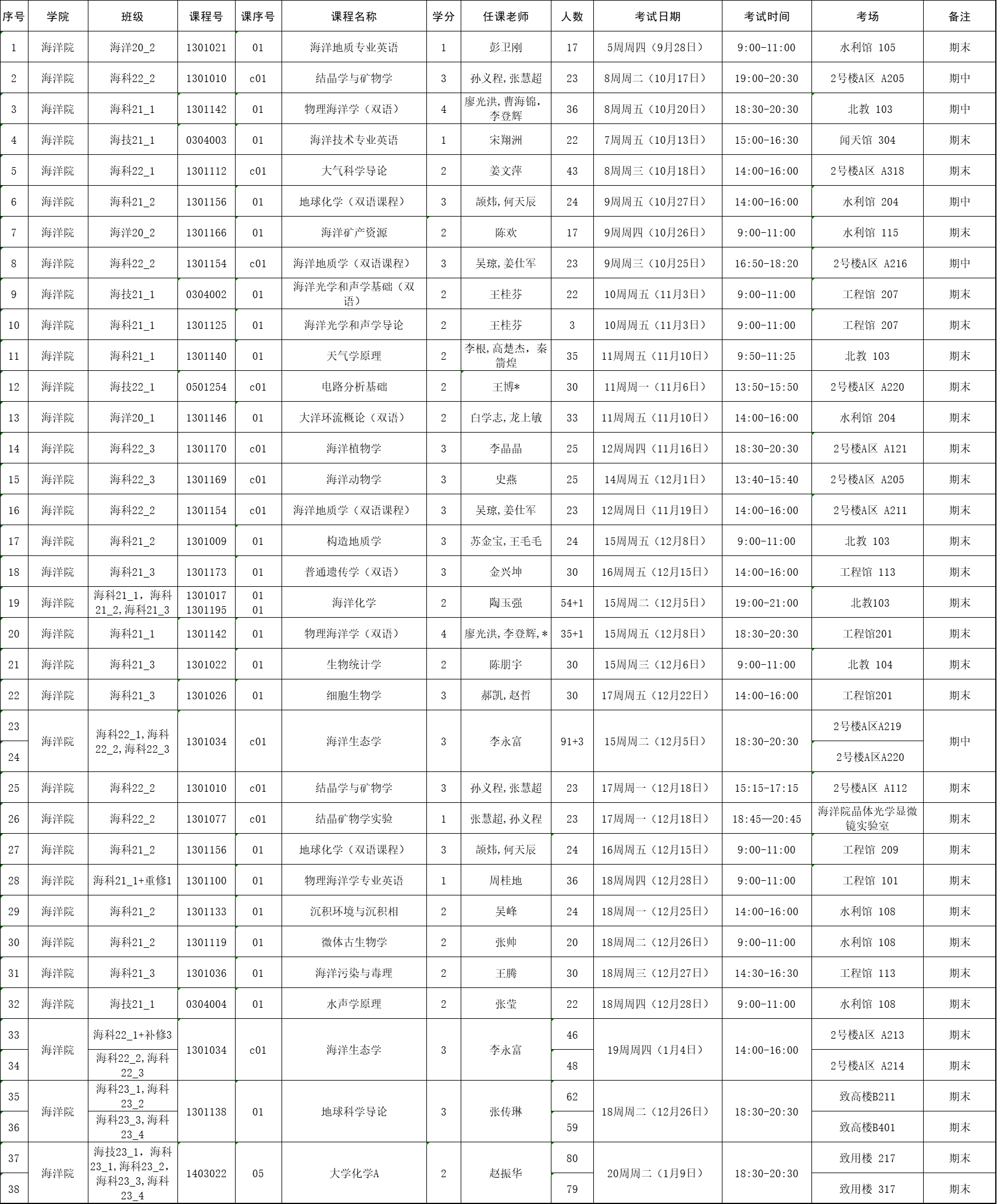 2023-2024-1学期海洋院专业课考试安排
