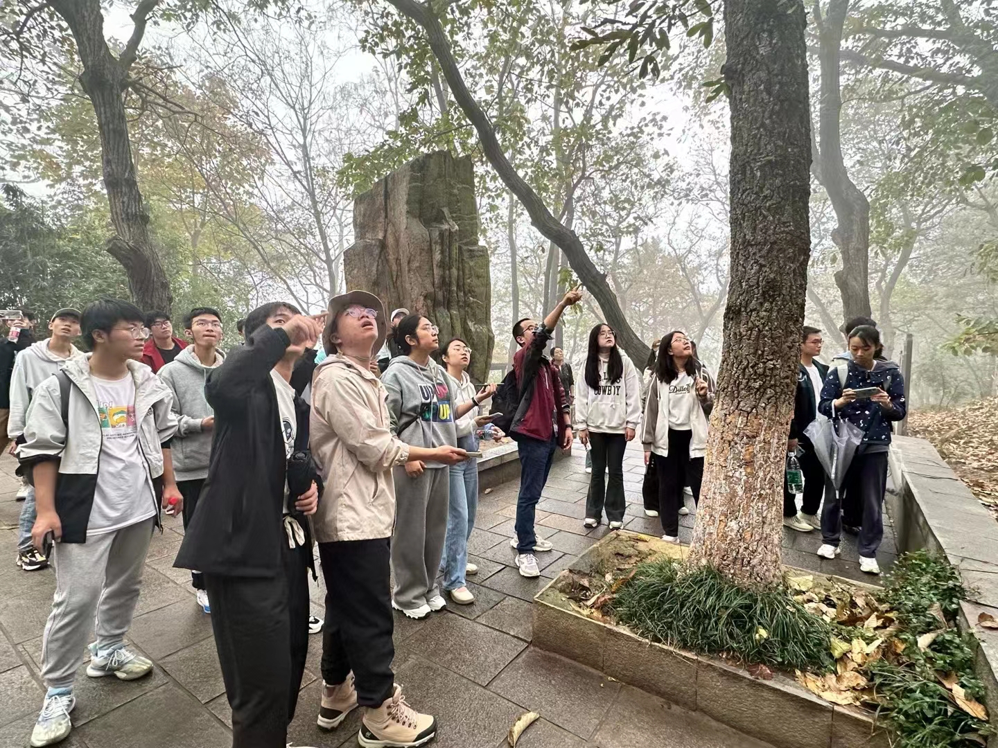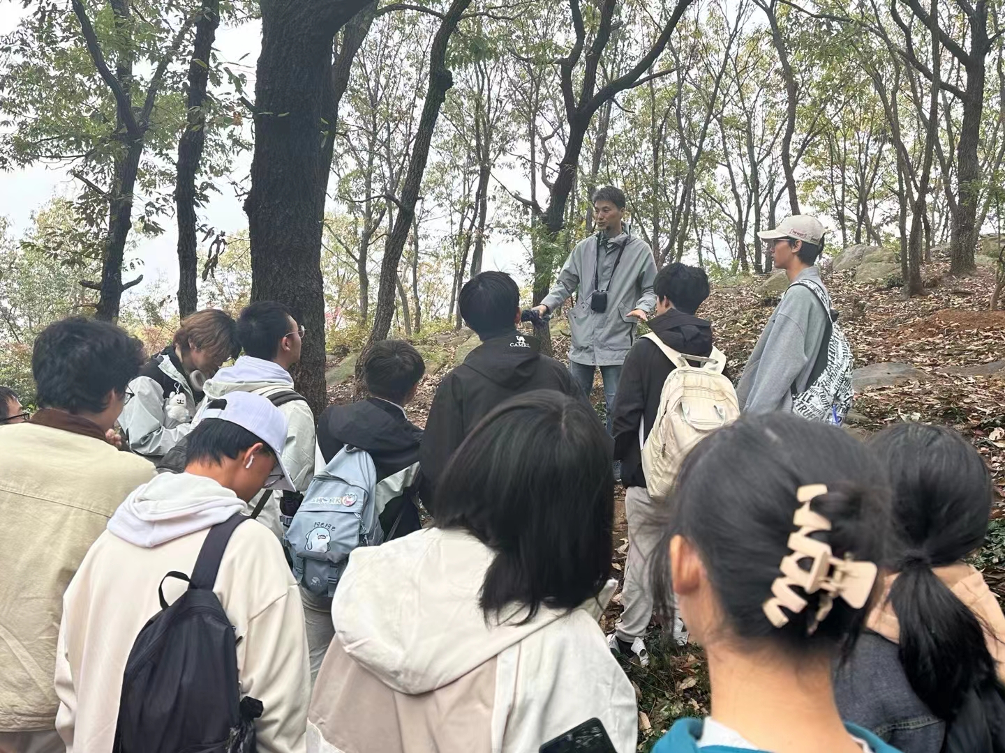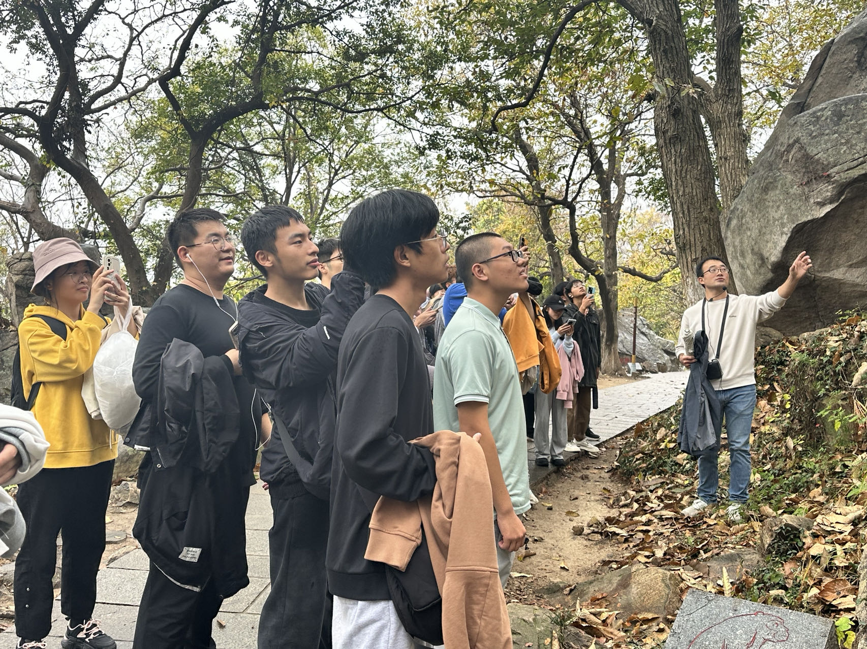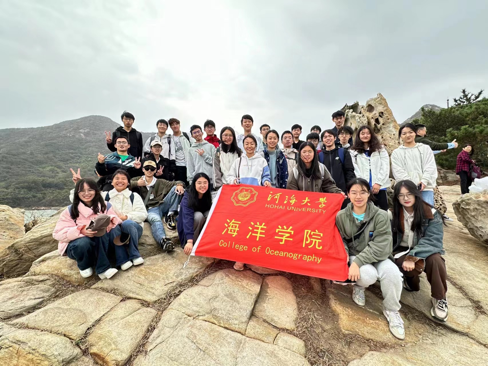 在花果山野外实习中,老师们为同学们讲解了花果山岩石的组成部分,以及山上各种怪石的形成原因。同学们不仅体验了爬到山顶的成就感,还在半山腰处发现了海蚀现象,这让他们对地质地貌有了更深入的理解。