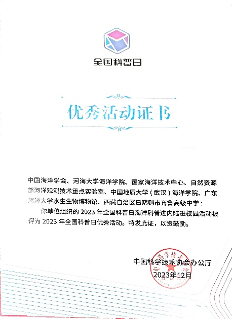 2023年全国科普日活动由中国科协等21个国家部委联合主办,于917日至23日举行,主题为“提升全民科学素质,助力科技自立自强”。磁力熊 中国海洋学会、国家海洋技术中心、自然资源部海洋观测技术重点实验室、中国地质大学(武汉)磁力熊 、广东海洋大学水生生物博物馆、西藏自治区日喀则市齐鲁高级中学等单位联合组织申报的“海洋科普进内陆进校园”活动被评为 2023 年全国科普日优秀活动。
