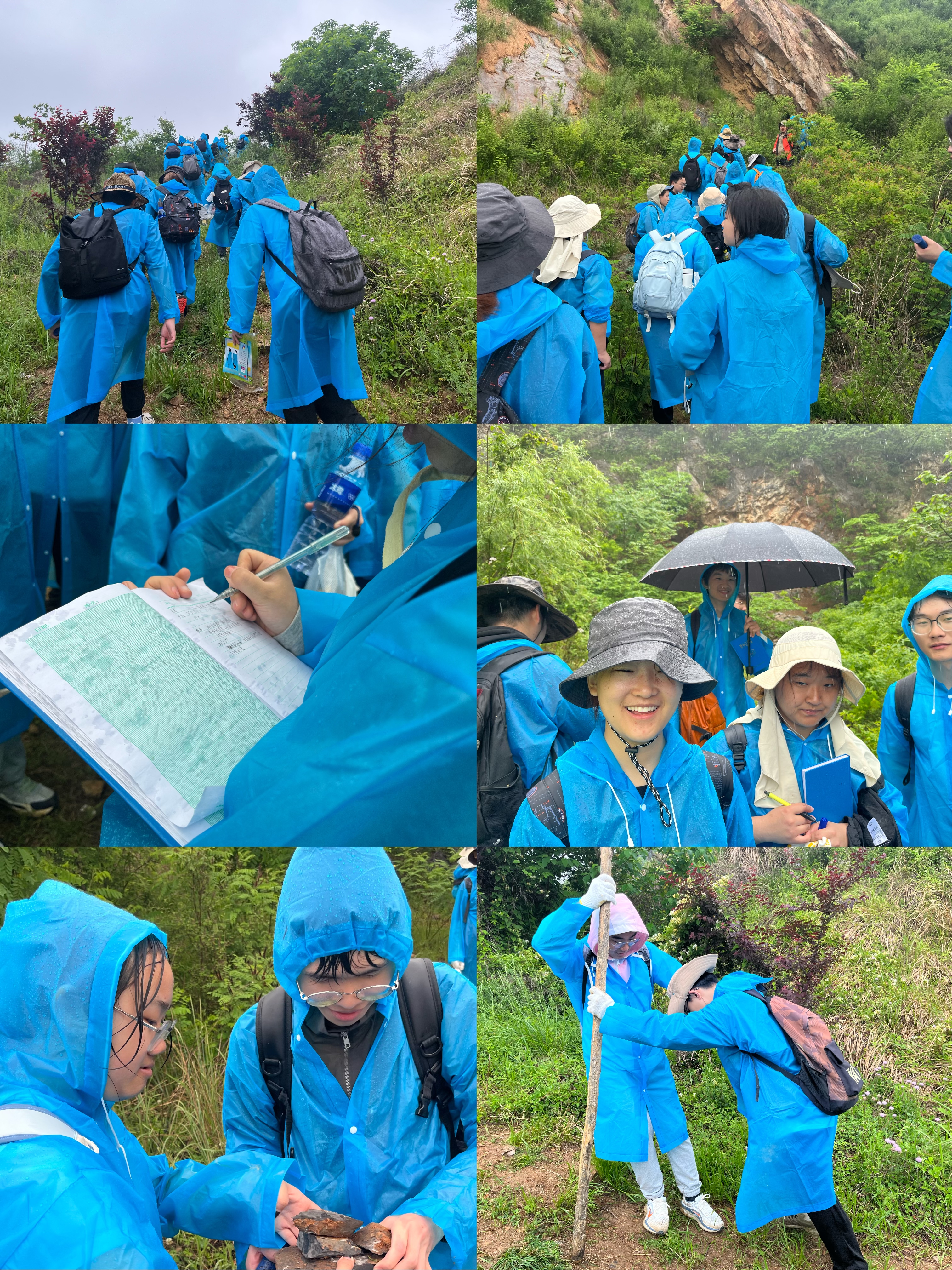 地质踏勘阶段共3天时间,4月27日师生一行人来到巢湖狮子口地区。在老师们的指导下,同学们全面学习了三点定位法、产状测量等野外地质技能,对沿路的露头进行观察、取样、描述。随后在28、29日,师生们又前往凤凰山、平顶山进行地质踏勘,全面了解该地区的典型地层剖面、填图单位的划分标志、各类地质体的主要特征、分布范围和接触关系、主要标志特征和矿产情况,为后续的填图工作作准备(图3)。踏勘阶段有时会遇到下雨天气,但师生们工作热情高涨,风雨无阻(图4、图5),在确保安全的前提下,尽量不耽误实习安排。