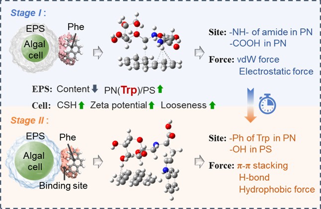 Trp组分调控藻类EPS与多环芳烃类化合物界面结合动态机制的示意图