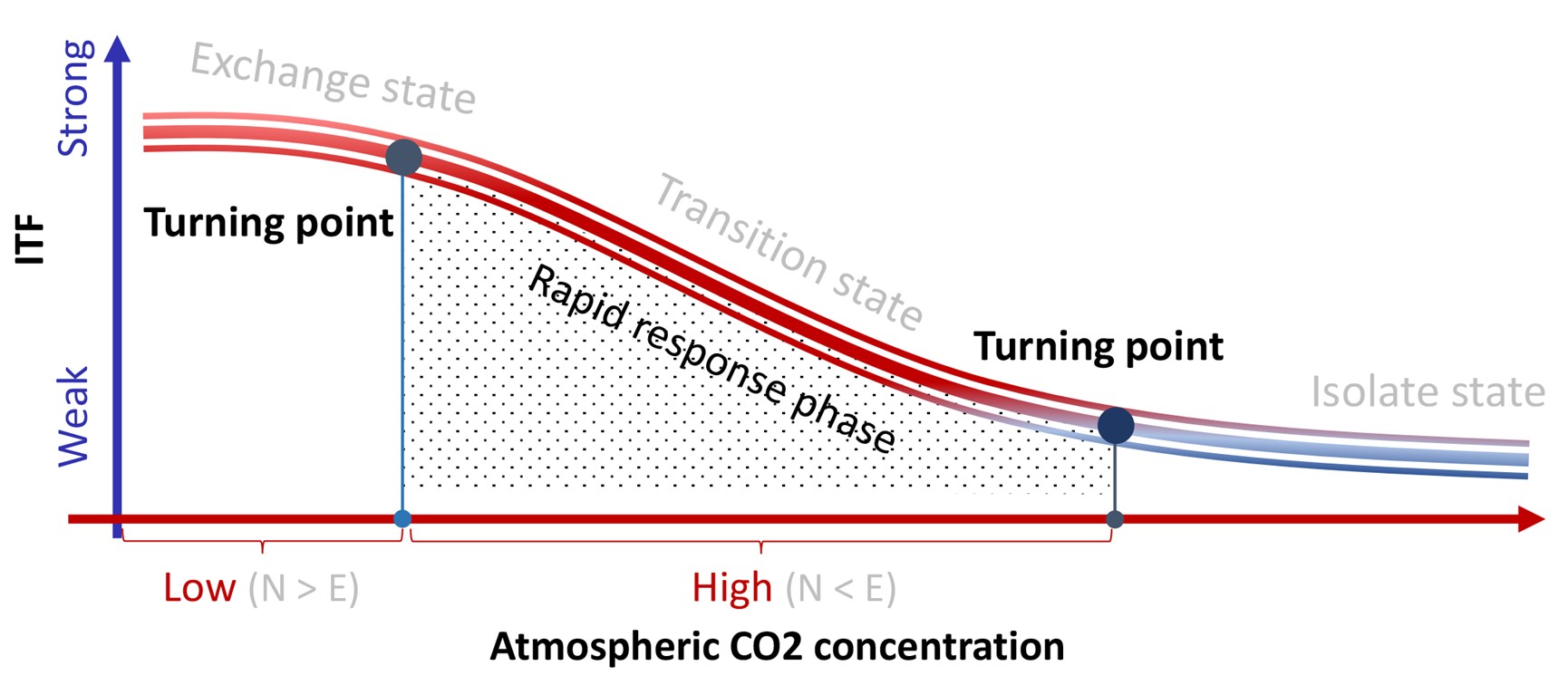 胡石建教授团队基于第六次国际耦合模式比较计划(CMIP6)的气候模型试验,系统分析了在历史时期与二氧化碳理想化1%逐年递增情景下印尼贯穿流的演变特征。研究发现,印尼贯穿流对二氧化碳浓度的响应具有明显的非线性特征和两个临界点,当二氧化碳强迫超过第一个临界点,减弱速度将急剧加快;直至达到第二个临界点后,减弱趋势再次趋缓并达到一个弱印尼贯穿流状态。研究指出当前大气二氧化碳总量或许已经达到了第一个临界点,意味着印尼贯穿流可能已进入“快速减弱期”,其强度在未来几十年内或将显著下降,最终可能减弱至目前的一半左右,导致印度洋-太平洋系统从当前的“交流态”转变为准“隔离态”,极大削弱两大洋之间的物质与能量交换。