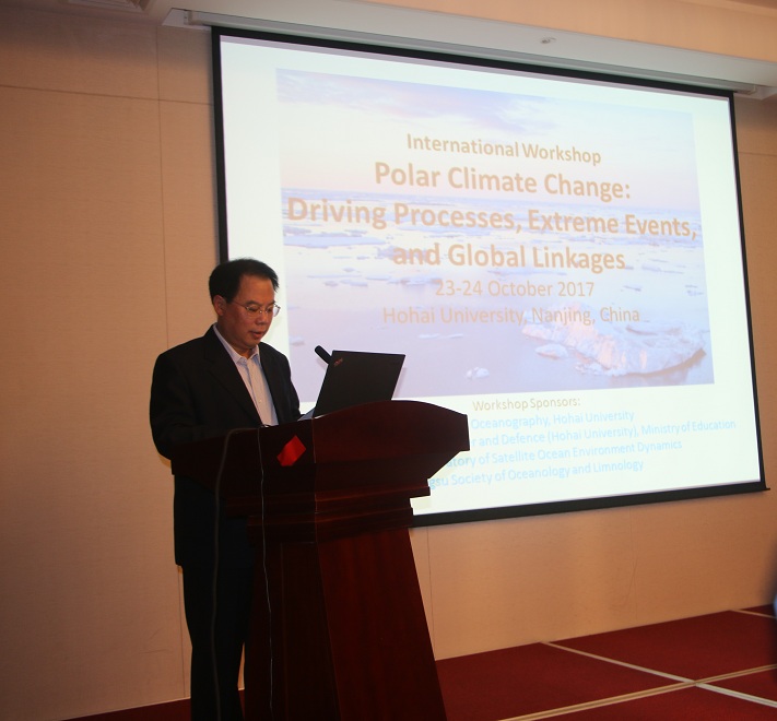 10月23至10月24日,极地气候和极端事件国际研讨会(Polar Climate Change: Driving Processes, ExtremeEvents, and Global Linkages)在河海大学国际交流中心隆重举行。会议由河海大学海洋学院、河海大学海岸灾害及防护教育部重点实验室、江苏省海洋湖沼学会联合主办。本次研讨会由河海大学海洋学院王召民教授、美国阿拉斯加大学费尔班克斯分校张向东教授、英国南极局John Turner教授、德国阿尔弗雷德魏格纳极地和海洋研究中心Annette Rinke高级研究员担任联合主席。王召民教授主持开幕式,河海大学校长徐辉出席开幕式并致辞。