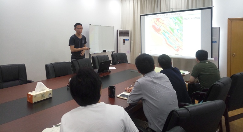 宋功化同学汇报的题目是:“褶皱的横向发育对地形地貌的影响以及横向连接模式研究”,阐述了评估褶皱横向传播的地貌条件,分析了几个褶皱横向传播的案例以及横向传播连接模式的数字模拟等内容。