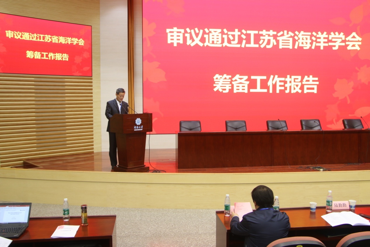 在接下来的第一次会员代表大会中,河海大学海洋学院院长齐义泉汇报了有关江苏省海洋学会的筹备工作。