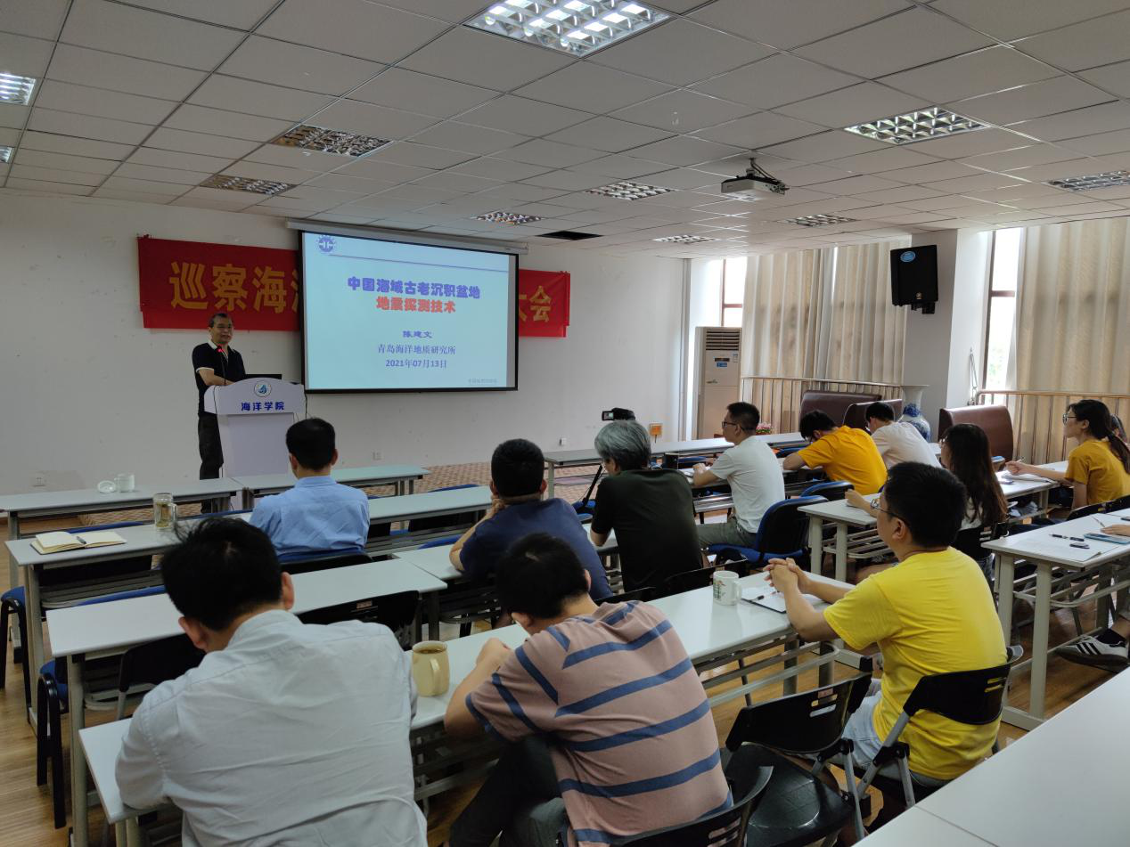 2021年7月13日,应我院海洋地质与地球物理系邀请,中国地质调查局青岛海洋地质研究所陈建文研究员做客“海韵大讲堂”学术论坛,为我院师生作了题为《中国海域古老沉积盆地地震探测技术》的学术报告。张鹏辉副教授主持报告会。