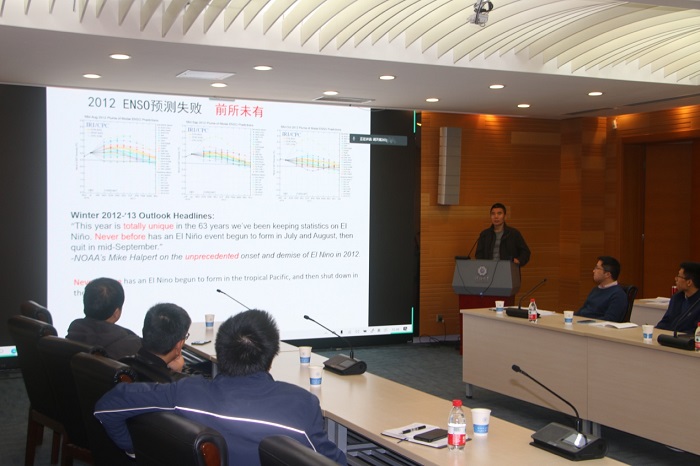下午的学术研讨会由河海大学海洋学院的王强教授主持。中国气象科学研究院的任宏利研究员应邀作《ENSO多样性研究进展》报告,介绍了ENSO的空间和时间多样性,并利用新的经验方法,揭示了新型ENSO事件在近40年来频发的原因;中国气象局地球系统数值预报中心的苏京志研究员应邀作《副热带太平洋海温对ENSO形成演变的调制作用》报告,从业务预报角度,介绍了两种对ENSO发生、发展具有重要影响的副热带太平洋经向模态,以及两种模态在ENSO业务预报中的重要作用。两位专家精彩的报告令在场师生受益匪浅。本次会议在热烈的研讨氛围中落下帷幕。