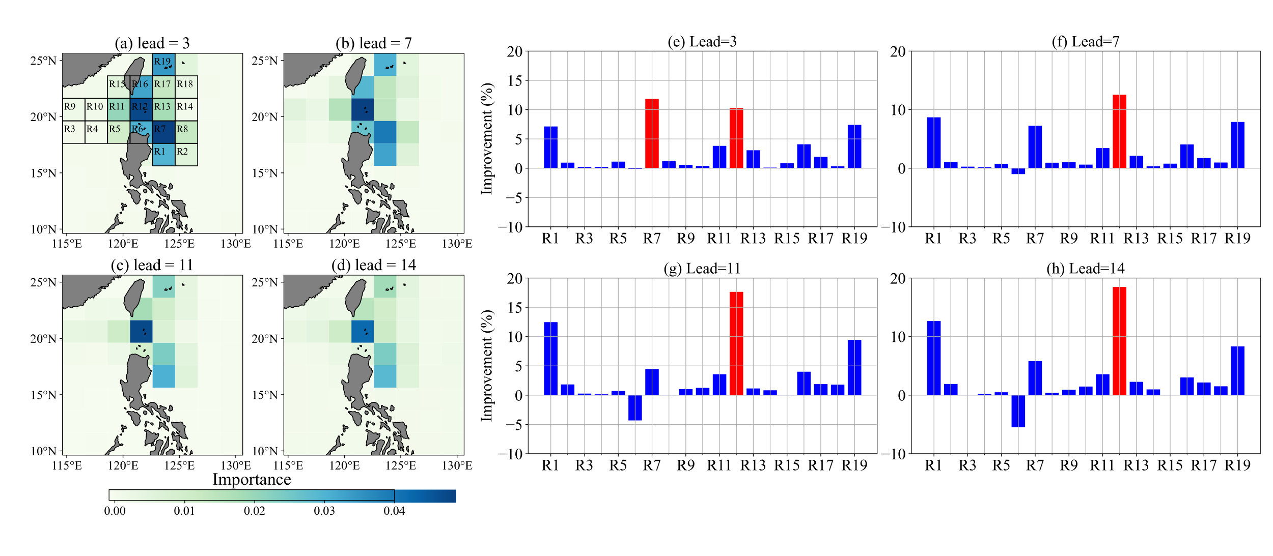图3. 当预测时长为3、7、11和14天时,黑潮入侵南海预测的敏感区域(a–d),及在该区域消除噪声相对不消除噪声的相对改善程度(e–h)。