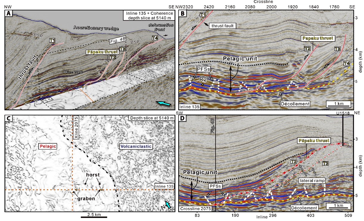 图2 NZ3D地震数据体构造解译揭示了PFSs在增生楔底部的位置及其与主逆冲断层的空间关系